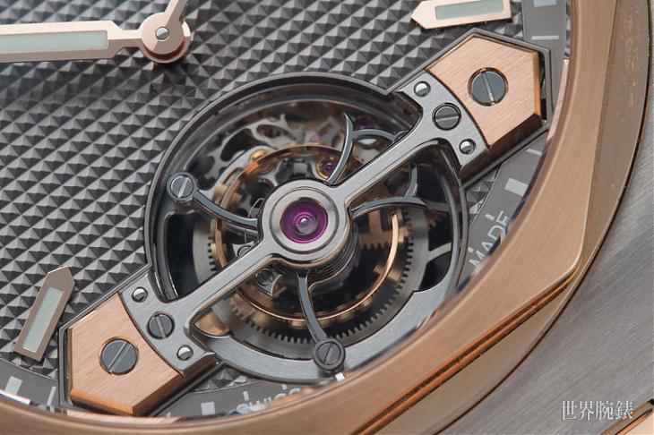 這款一共有兩個版本,除了這次看到的鈦金屬/玫瑰金版本,另外還有鈦金屬/白金版本,純粹以視覺效果來看,雙色半金會讓人感覺更高貴一些。從一些細節像是帶有釘紋裝飾的面盤,圓中帶八角的錶圈,機芯細緻的拋磨與倒角處理,還有擒縱結構的活動式游絲固定裝置(此為日內瓦印記必備的要求,也是高級錶的一項特徵),我試過以15倍放大鏡仔細端詳,發現它的每一個細節都很到位,簡單來說確實是一只品質精良的高級陀飛輪腕錶。
