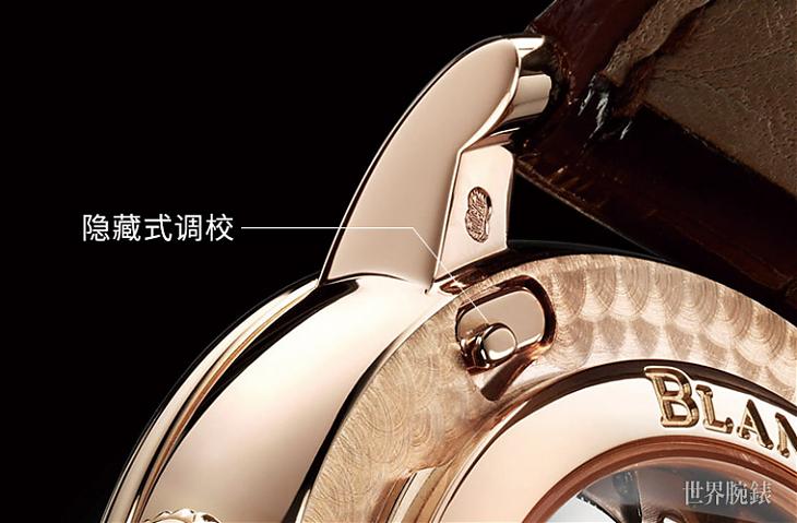 ▲全日曆乃至更高複雜功能配上月相顯示如果設有快調裝置則無疑能增益佩戴者的實用便利性,寶鉑著眼於此,更考量到視覺美觀而開發出藏於錶耳後面的隱藏式按把,令腕錶線條更優雅從容。