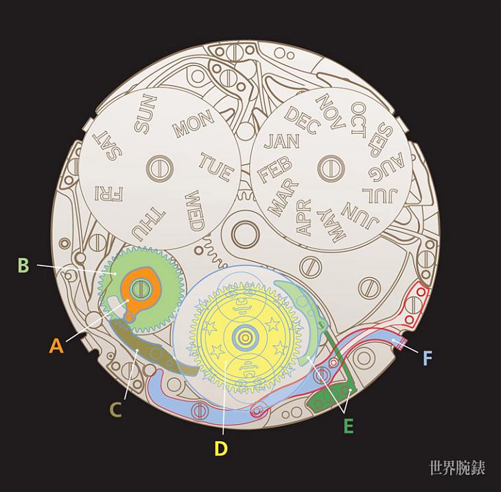 ▲針對腕錶的調校,寶鉑也貼心地研發出日曆/月相安全保護調校系統(安全系統以此圖為例約介於圖中A與B兩枚零件之間),即使在換日同時調校時間,亦不致對機芯造成損傷負擔。