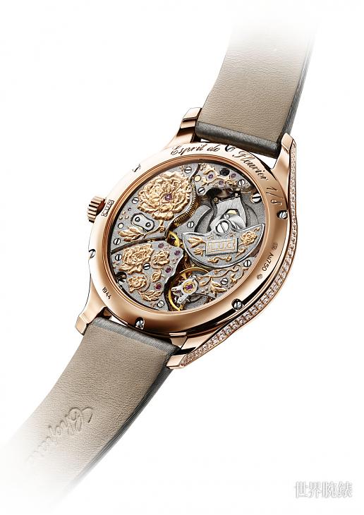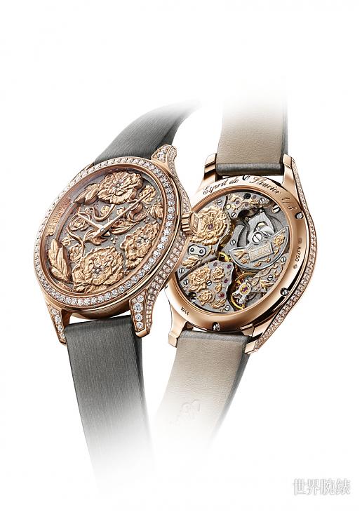 這只腕錶上的牡丹花創作靈感是來自弗勒里耶小鎮,這個小鎮坐落在寧靜小山谷中。春天一來,滿山谷便野花處處,繁花盛開,「弗勒里耶」因而得名(Fleurier其字根意謂「花」)。而這座小鎮也孕育了眾多傳統製錶工藝,其精湛工藝的聲譽甚至跨越國界。這些時計魅力也來包含了浮雕技術,該技術能突顯出渦形或花卉圖案雕紋,生動地呈現出花朵初綻的一面。