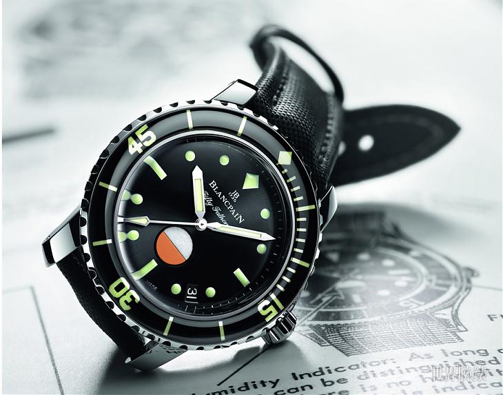▲簡約俐落的幾何圖形時標與如今看來潛水錶必備的潛水錶圈,都是寶鉑開創的設計,十二點鐘位置的復古五十噚字樣,更讓人彷如回到五○年代的懷舊美好。