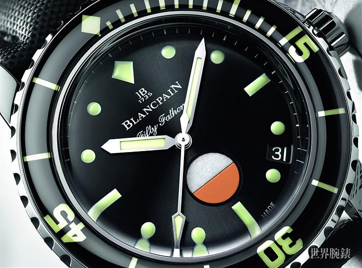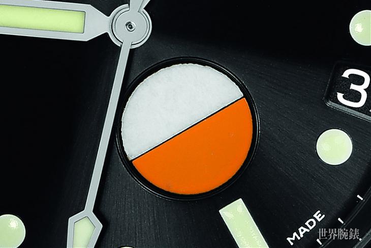 ▲六點鐘位置看似一幅落日的圓形圖標顯示,其實是寶鉑自五○年代五十噚開創以來所擁有的特殊濕度顯示計功能,只要有水氣滲入錶款中,白色部分就會慢慢轉為橘紅,以此提示用家。