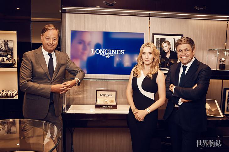 ▲凱特凱特.溫斯蕾(中)與浪琴表全球業務副總Mr. Villioz Charles(左)、浪琴表全球副總裁暨行銷總監Juan-Carlos Capelli(右)合影。