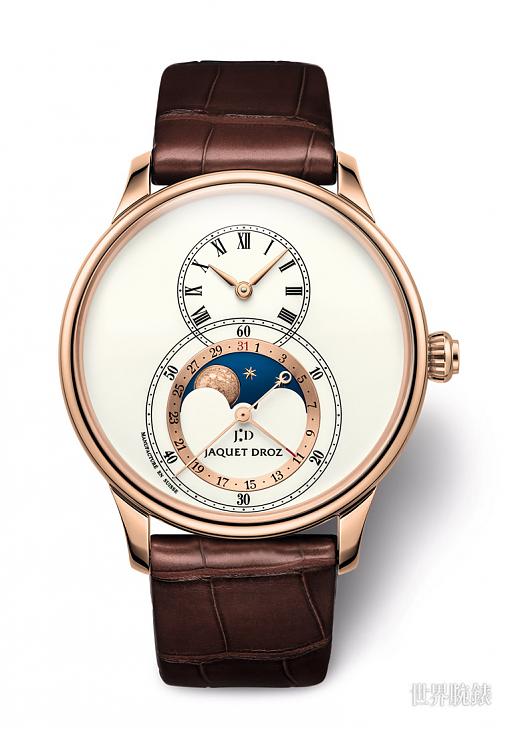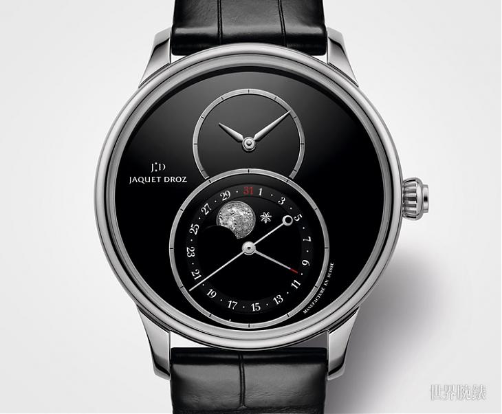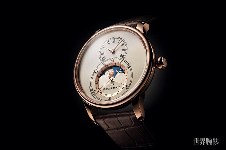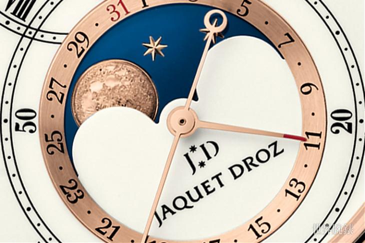 月相功能作為裝飾性比重較高的考量,有不少品牌在採用這項功能時都相當注重月亮本身的質感,講得更仔細一點,即是放入面盤表面的月相除了轉印以外,有些品牌為了強調月亮的凹凸有致,會使用立體的方式浮現在面盤上,有的品牌或者採用較為童趣的月相臉孔,譬如寶鉑月相經典的五官表情,然而要如何將月相刻畫地漂亮,這其實又是一門藝術,譬如2016年OMEGA超霸系列就使用有如美國天文台所觀察到的月亮影像,原封不動地移植到盤面上,以此突顯出一流的質感。雅克德羅這次在自家的主力大秒針系列首度放入月相功能,又汲取他們家出眾的雕刻技術,將這細膩到不行的工藝水準移植到月相呈現上,不得不說真的結合得相當成功,因為從大秒針的月相顯示上可以看見彷如真實月亮的陰影凹凸,而且這凹凸有致還不是用轉印的方式實現的,算是結合JD招牌雕刻手藝下的天作之合!