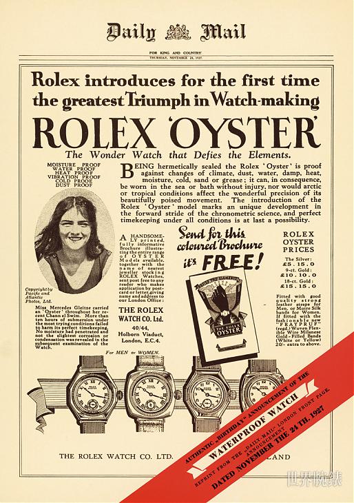 ▲1927年英國游泳選手Mercedes Gleitze小姐便是佩戴勞力士的蠔式腕錶成功泳渡英吉利海峽,向世人展示出錶款突破傳統腕錶防水基準的長足進步。