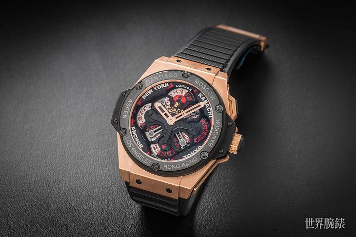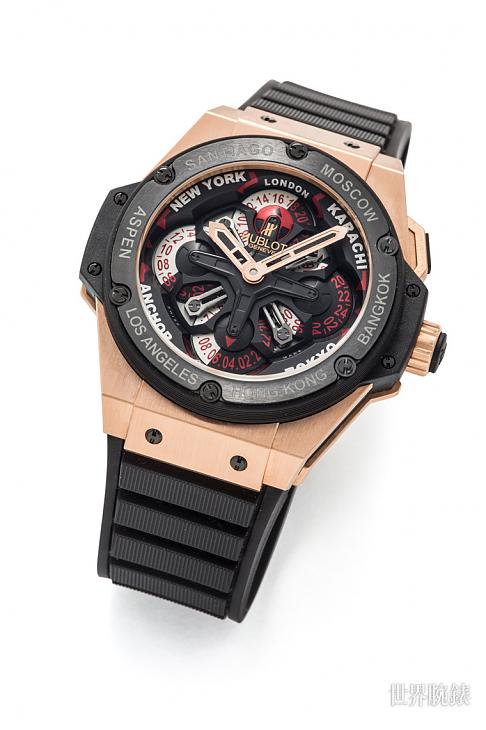 King Gold材質/HUB 1220自動上鍊機芯/時、分顯示/13地時區顯示/藍寶石水晶鏡面、透明底蓋/防水100米/錶徑48mm/參考價:NT$ 1,579,000