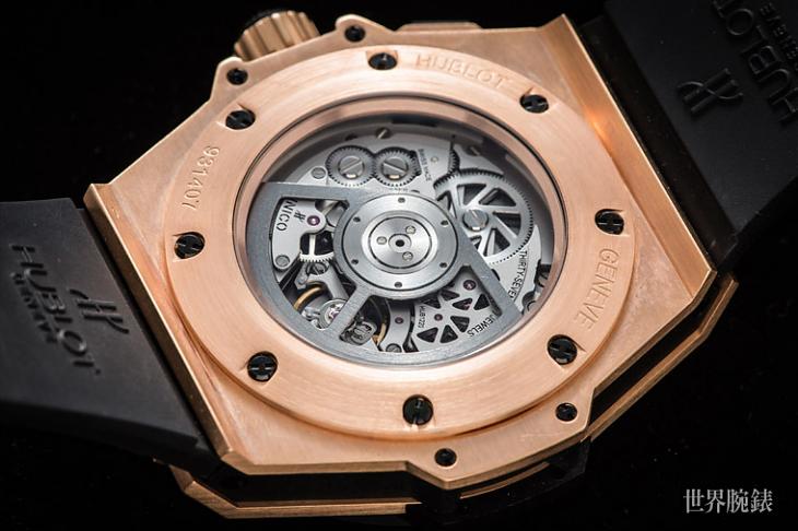 ▲從正面的四枚小鋁盤結構便可知道整枚機芯重新安排的複雜佈局,而翻轉至錶背底蓋,更可以欣賞到HUBLOT風的內部複雜機芯的安排,從鏤空的自動盤上也可以欣賞擺輪作動的姿態,一飽機芯迷眼福!