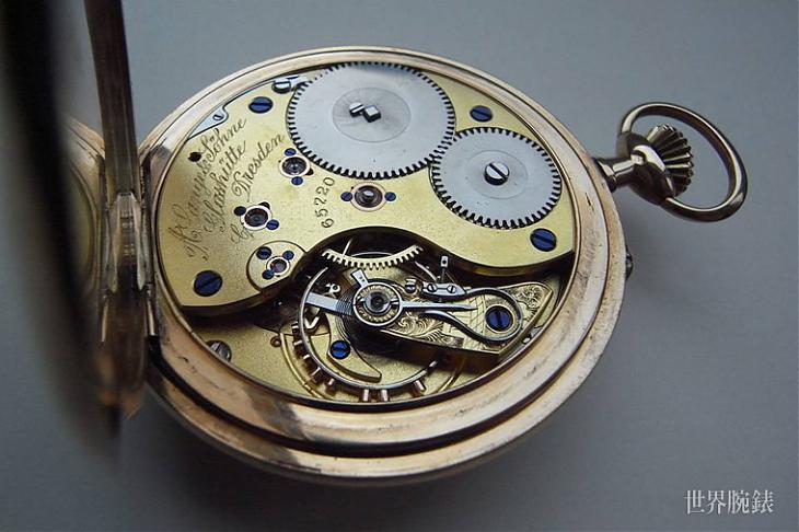 2017年新款的年曆錶搭載手上鍊機芯,更能展現工藝,與先前朗格機芯不同在於露出了大鋼輪(下方為發條盒),我收藏的1930年代朗格懷錶有類似的結構,可見同宗同源。更精進的是機芯大鋼輪旁的擋仔還加了一根以整塊金屬雕琢而成的彈簧,完全是高檔次的做工,即使目前一線品牌也罕見。