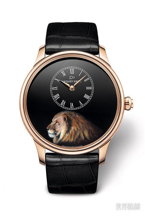 同系列尚有時分小針盤-獅王腕錶,這款描繪的對象是象徵力量、尊榮與權力等正面意涵的百獸之王——獅子,雅克德羅把微縮繪畫和黑色大明火琺瑯渾然融合,大明火琺瑯採用深邃均勻的黑色調,以突顯微縮畫作的雋永美感,此幽深魅惑的底面為裝飾圖案賦予獨特的立體感,展現畫家運用細如纖毫的筆尖作畫的精準技法,工匠筆下的獅子臉部鬃毛夾雜著棕色、黑色及紅色等豐富色調,側面獅身則巋然不動,展露智慧和莊嚴之相,猶如照片般細膩刻畫,栩栩如生,似有躍躍欲動之感。這款僅限量發行28只,並附有負責制作錶款的工匠大師親筆簽名的藝術工坊真品證明書。