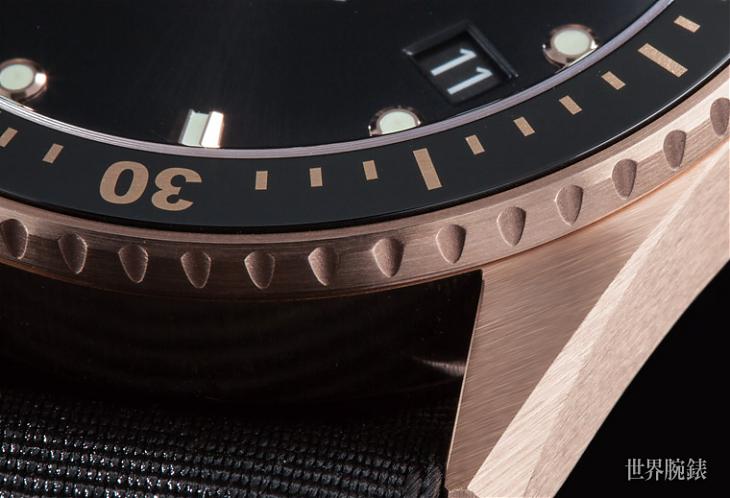 錶款最為突出的改變為18K玫瑰金材質的加入,品牌以黑色陶瓷與18K玫瑰金組合成色澤溫潤的單向旋轉錶圈設計,在運動感中添上婉約雅致的個性,錶圈上分別配以液態金屬Liquidmetal®及18K玫瑰金所造的圈上刻度,Liquidmetal®這一非晶態金屬合金可以防止任何形變,相當堅實,有效提升腕錶的抗刮磨與耐用性,而對潛水錶至關重要的防水深度更來到300米水準,應付日常或專業潛水活動之用皆綽綽有餘。