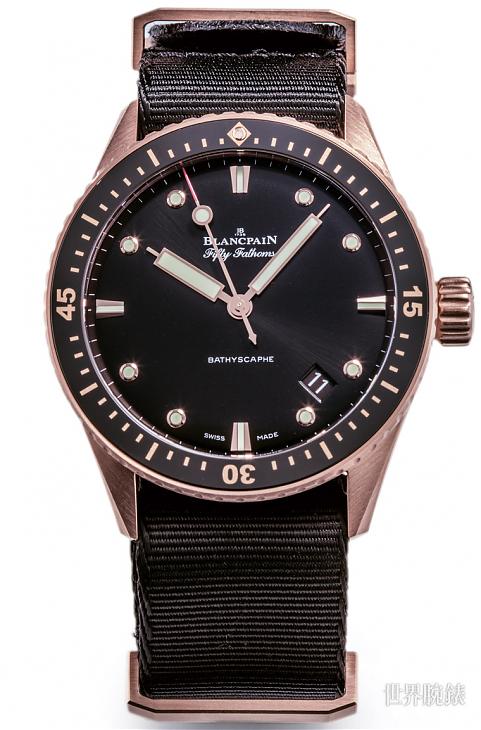 這款是寶鉑在2015年推出三針加日期、配上18K玫瑰金點綴的Fifty Fathoms Bathyscaphe新作,傳承經典時計的風格。Fifty Fathoms Bathyscaphe以簡潔的造型登場,設計上依然承襲原版的眾多元素,以保留前作清晰明朗的風格。透過專利視窗顯示日期,指針所採用的舊版傳統樣式讓其與前作連結的同時,獨特的設計也增加了夜光塗層的大幅呈現,確保腕錶在任何環境下都能被清晰讀取時間。