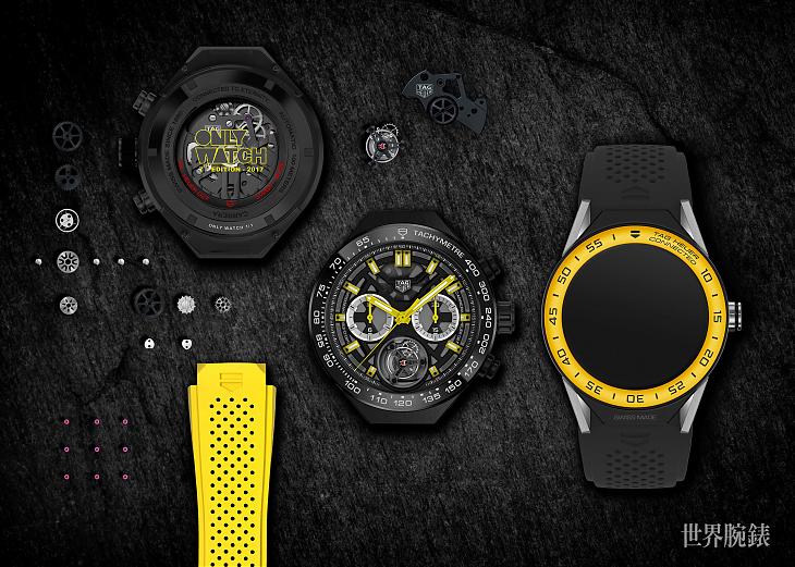 豪雅的Only Watch特別版套組包含全新豪雅 Connected Modular 45智慧腕錶,以及Heuer-02T C.O.S.C.陀飛輪計時碼錶可拆換錶頭。兩者皆具備象徵Only Watch的黑色與黃色。Connected Modular 45智慧腕錶,擁有純正的瑞士高級腕錶血統,Only Watch版本使用黃色錶帶與錶圈,並搭載Intel技術,防水性能達50米,具備全球定位系統(GPS)和近距離無線通訊(NFC)的電子支付功能(可使用Android Pay)、高畫質AMOLED螢幕與無數的TAG HEUER客製化錶面選擇。Google的Android Wear 2.0與全新的TAG Heuer Companion行動應用程式也將帶來更進一步的軟體使用經驗。