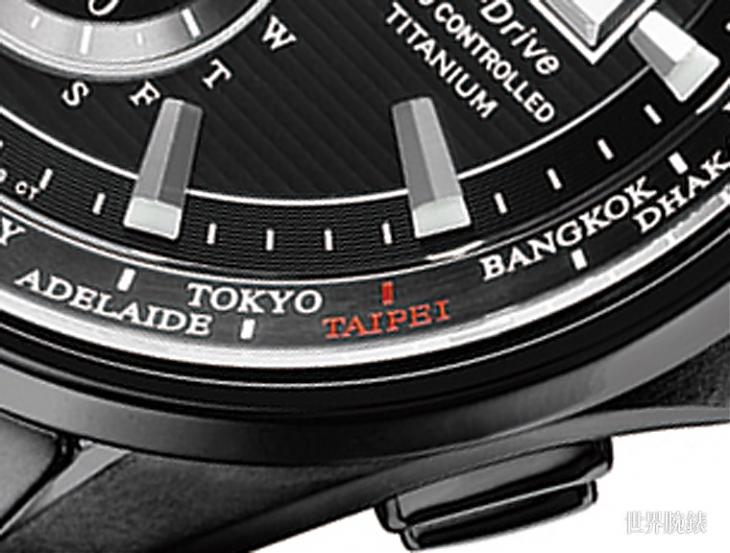 在光動能全球電波時計錶AT8135-87E的面盤26個城市時間當中,特別將5點鐘位置改為TPE時區。