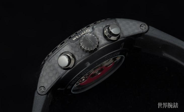這次特別使用的碳纖維材質在錶款各個細節上都可以見到,使用碳纖維材質的面盤、錶耳、錶圈等,無一不是為了達到輕量化的目的而設,碳纖維作為在賽車界常見的材質,擁有高強度、高硬度、抗高溫、輕量化等優點,因此比起一般常見的不鏽鋼材質來說,除了在視覺上擁有無人能及的棋盤式美感外,比不鏽鋼還輕上五倍的重量,是運動錶愛用材質的不二選擇,尤其ORIS更展現了從Formula 1研發出來的專利製造技術。編織碳纖維增強聚合物以人工方式層疊在單獨的模具,然後放入130℃的特殊烤爐硬化兩次,錶殼僅重7.2克,因此以賽車為名的Williams碳纖維計時碼錶,使用這款材質可說是天作之合。