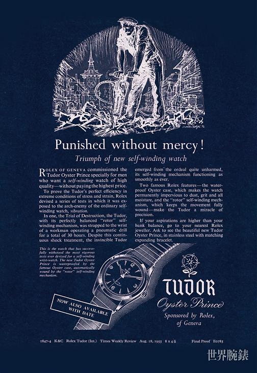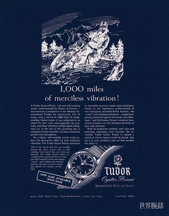 1952——TUDOR Oyster Prince推出,同時舉辦一系列有力兼具創意的發布活動。這些廣告不僅採用當時常用的產品展示及演繹手法,而且通過大篇幅文字配合圖片來表達產品的耐用性、可靠性及精確度。