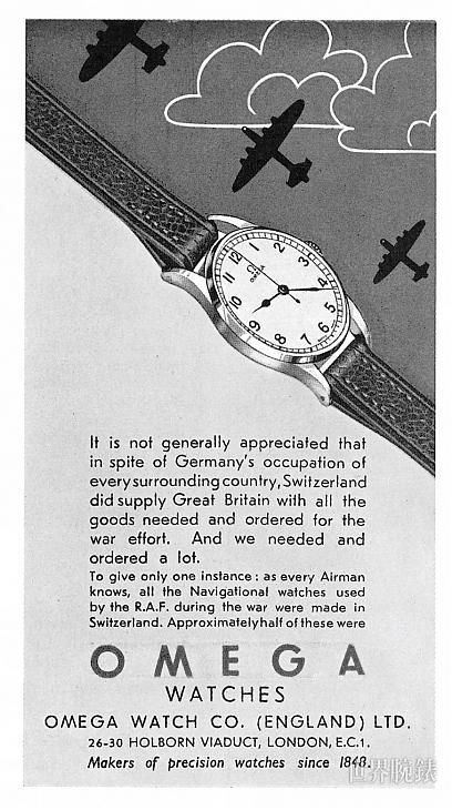 在第二次世界大戰中,享譽在外的歐米茄腕錶再次成為軍方的選擇。事實上,歐米茄為英國國防部的空軍、海軍和陸軍士兵提供了110,000餘只腕錶,大力支持了空軍和海軍飛行員的軍事行動。英國、美國、法國及希臘等同盟國都曾在戰爭期間為士兵配備歐米茄腕錶。