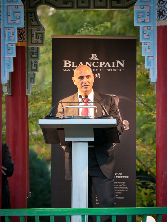 位於蘇黎世的知名景點中國花園(China Garden) 是由昆明市所贈的交流獻禮,BLANCPAIN特別選在此地點舉行新錶款的全球發表會。晚宴中,許多賓客有機會拋開西方一般對於時間判讀方法的舊有規則,一窺中國傳統曆法之工藝。在此款全新鐘錶大作中,不僅可窺見豐富技術細節與文化多樣性,更可體驗藝術專業的不同表現形式。水是中華文化的五行元素之一,而BLANCPAIN總裁暨執行長Marc A. Hayek就在花園的觀賞池塘中央小島上,見證全新錶款的技術工藝並揭曉此鉅作的靈感起源,他表示:「錶款的完成代表歷經五年的搜尋與研發累積,更反映出BLANCPAIN在中國的發展歷史。」 因此蘇黎士中國花園便成了該錶款上市的最佳場地,展現花園的不凡氣勢。