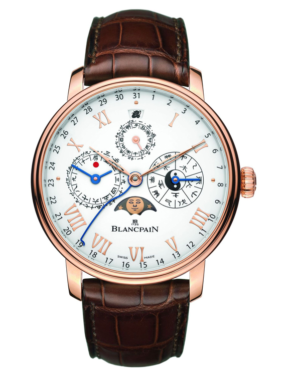 BLANCPAIN Traditional Chinese Calendar中國傳統曆法手錶根據已在中國傳統紮根數千年的基礎曆法打造。在華美的面盤上,時針、分針以及西曆皆與中國曆法的主要指針並肩排列:傳統兩小時指示、日、月(包含閏月指示)、十二生肖,更有五行元素與十個天干文字.。十干與代表地支的十二星座組合後,形成以六十年為周期的甲子迴圈,同時也是中國文化的核心。月相顯示為BLANCPAIN全日曆系列錶款的主要元素,考慮到月亮週期與傳統中國月份密不可分的關係,此功能在中國傳統曆法手錶中當然是不可或缺的重要角色。全球限量20只的錶款搭配鑲有馬德加斯加紅寶石的白金自動盤,盤面特別雕琢祥龍圖樣,以紀念在中國曆法中2012年所代表的龍年。此外Traditional Chinese Calendar 中國傳統曆法手錶同時推出非限量版的玫瑰金錶款。