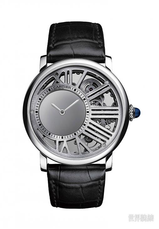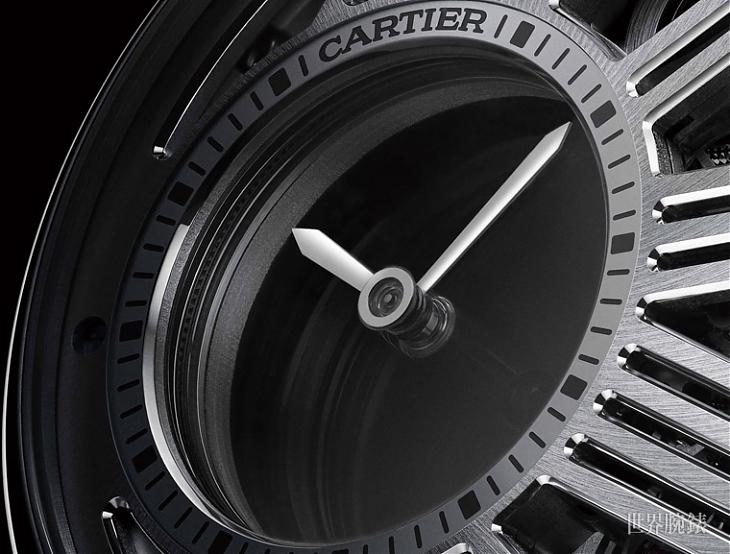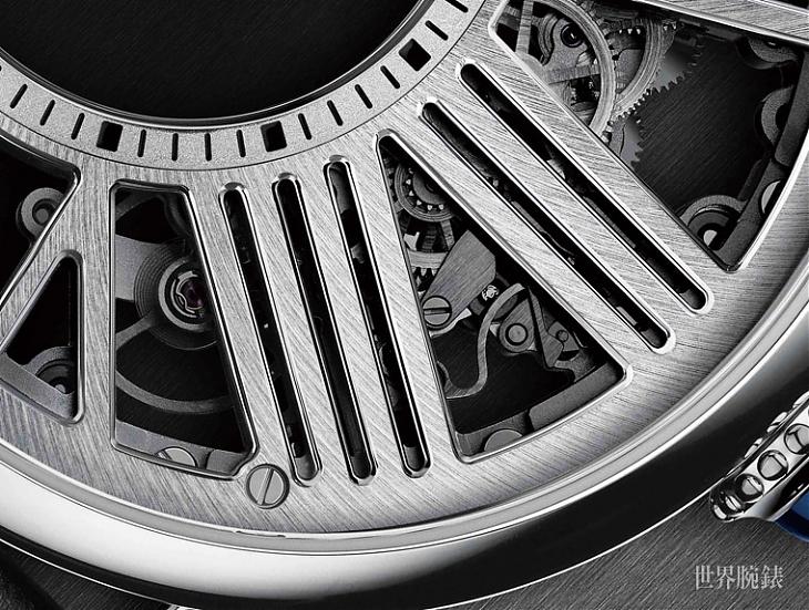 原本在人們的觀念中,神祕顯時裝置為了要維持它機芯特殊結構的設計,往往只會露出「神祕」的那一面,其餘機芯結構則必須完美隱藏才不會有破梗的疑慮,而Rotonde de Cartier神祕小時鏤空腕錶卻偏偏逆勢而行自行揭開了機芯的面紗,不過仔細觀察會發現在時、分錶盤的周緣因為有分鐘刻度環的覆蓋,依舊巧妙地遮蔽了藍寶石水晶圓盤邊緣的齒輪傳動機制,演繹出露得好更露得巧的精密設計思維。若與Rotonde de Cartier神祕腕錶相較,新作中一些面盤的元素也有稍做調整,例如原本在3點時標最上方橫線的"CARTIER"字樣被移到分鐘刻度環上方,而刻度環本身也移除了上下兩道框線,默默呼應鏤空設計的精簡主旨(包括羅馬數字時標內也不再填充上色,僅以機芯骨架的純粹感示人)。