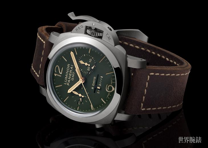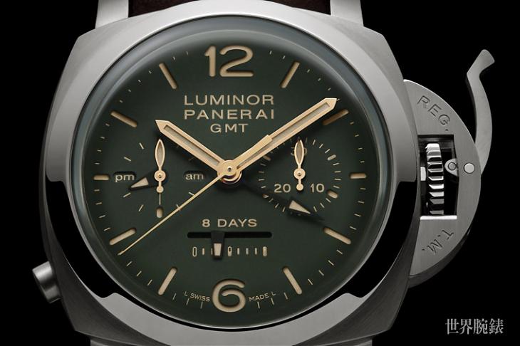 ▲這次的專賣店綠面版功能最複雜的當屬PAM00737,這款具備兩地時間加計時碼錶功能,動力儲存也來到8日之多,搭配品牌著名的錶冠護橋裝置,該有的功能與元素一次滿足。