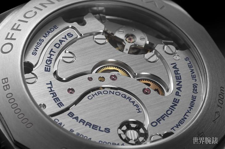 錶款搭載的P.2004機芯完全由沛納海諾沙泰爾製錶廠自主研製,採用導柱輪及垂直離合器等高端規格,前者可從機芯背面的藍寶石水晶視窗一覽無遺。計時碼錶的分針以跳動模式前進,令讀時更簡易。腕錶配備獨特裝置,當拉開錶冠調校時間時,平衡擺輪震動中止,秒針即時歸零,達致精準對時。Luminor 1950 Chrono Monopulsante 8 Days GMT Titanio 8日動力儲存單按把計時兩地時間鈦金屬腕錶配合系列其他型號,同樣以優雅的綠色櫻桃木盒包裝。盒內配備可供替換的黑色橡膠錶帶、替換錶帶的工具及螺絲起子。