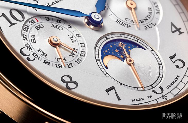 ▲1815年曆錶將日期與星期同軸設於面盤9點方向,和具備同樣功能的Saxonia年曆錶在面盤細部格局上擁有各自的區辨特徵。至於錶款的月相顯示精準度還是保持在每122.6年才會累積一天誤差的優異水準。