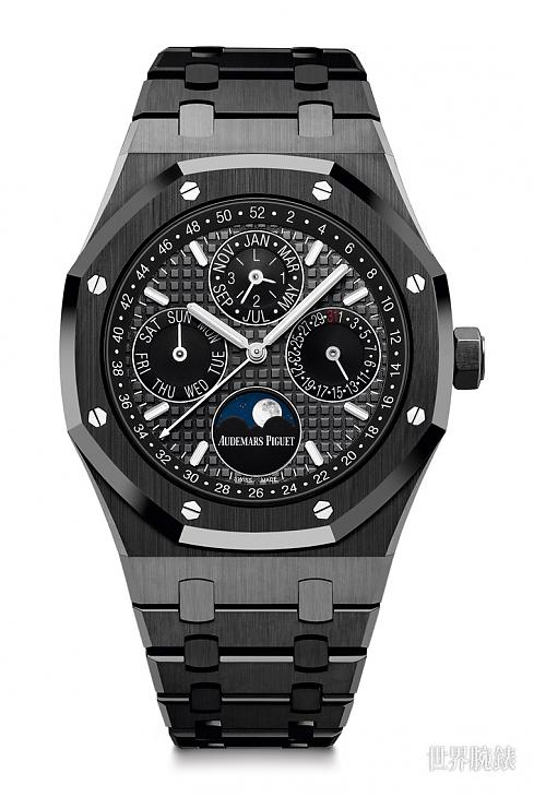 2017年AUDEMARS PIGUET愛彼在錶展上發表的這款黑陶瓷版皇家橡樹萬年曆同樣也是令人驚豔的一款。陶瓷材質在AP並不罕見,不過這種科技素材過去多半用在離岸型或是概念款這些比較前衛的產品中,直接用在皇家橡樹上的就有點稀奇了;另一方面陶瓷外裝如今在錶界原本應該已經見怪不怪了,然而AP的這款卻仍然能帶給我們相當新鮮的印象,讓人會想要細細研究。