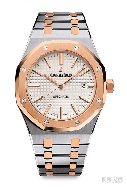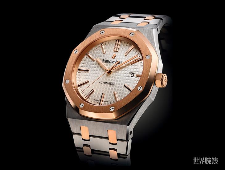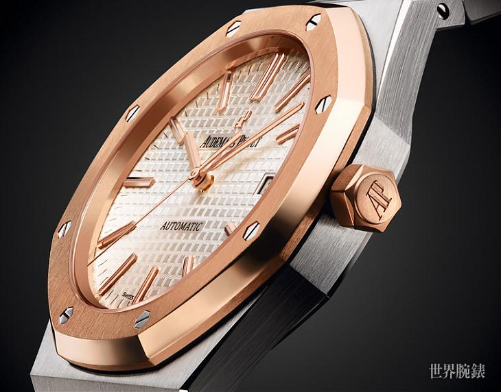 本次愛彼在材質上做文章,新作保留了不鏽鋼材質,但將錶圈、錶冠、鍊帶中節以及時標、指針改為玫瑰金,其帶有的柔和氣息帶來嶄新視覺效果,耳目一新。錶款搭載3120自動上鍊機芯,防水深度達50米。尺寸上較之當年被視為誇張尺寸的39mm,如今的41mm倒是大小適中,符合時代潮流。