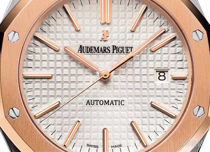 這只半金款與原始皇家橡樹腕錶在外觀上非常接近,甚至容易被誤認為同款腕錶。其面盤上設有指針與日期顯示,乾淨俐落,面盤上鐫刻"Grande Tapisserie"大型格紋裝飾。此裝飾是愛彼獨家工藝,由品牌內部獨門機器在切出方塊時同時壓印出網狀格紋,為該系列獨有標誌。這自1972年即成為經典的原創元素,與八枚螺絲固定的八角錶圈同樣是新作必然繼承的特徵。