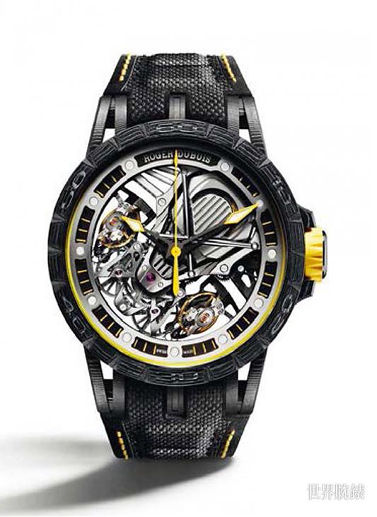 此次合作決心為消費者打造極致體驗——例如置身於藍寶堅尼跑車中,因此他們分享彼此的設計資源,首次創出兩款以高貴高科技材質製造並且具備卓越性能的腕錶:其中一款採用複層碳纖維,另一款則採用與藍寶堅尼汽車相同技術製成的C-SMC(片狀塑模)碳纖維,成為全球首款運用此材料的8只橘色裝飾限量版腕錶。讓這些碳纖維材質同時展現雅緻造型與運動精神,並且保有一份豪華顯赫的獨特氣質,成為腕錶製作的一大挑戰。羅杰杜彼的工程師和設計師們在時計中央創造出一個別具魅力——猶如超跑車配備一般的動力儲存顯示裝置,成為腕錶的核心標誌。