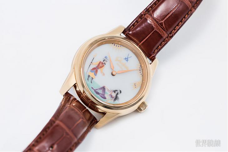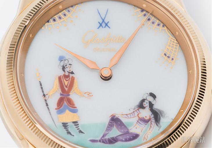 這款格拉蘇蒂原創 x MEISSEN名瓷「1001夜」限量版是2007年品牌為了日本市場打造的限量版,發行數量只有少少的20只。錶殼選擇高貴的18K玫瑰金製成,從錶圈上的坑紋設計可以看出與現行款式的今昔對比,面盤上描繪的是深入人心的波斯傳統故事集——1001夜故事橋段,選擇這個主題並非刻意為之,而是MEISSEN原本旗下作品中就有這麼一個暢銷人氣作品,這系列除了展現出相當細膩的畫工,得力於1001夜的豐富內容,所以它的圖案靈感可說是源源不絕,麥森將紙本敘述裡的場景活靈活現地展現在瓷器甚至腕錶面盤這麼小的空間上,像是這款就將人物的姿態、表情描繪得絲絲入扣,很自然就將人帶入故事的情境中。