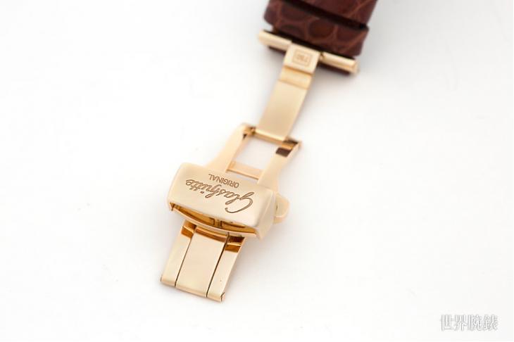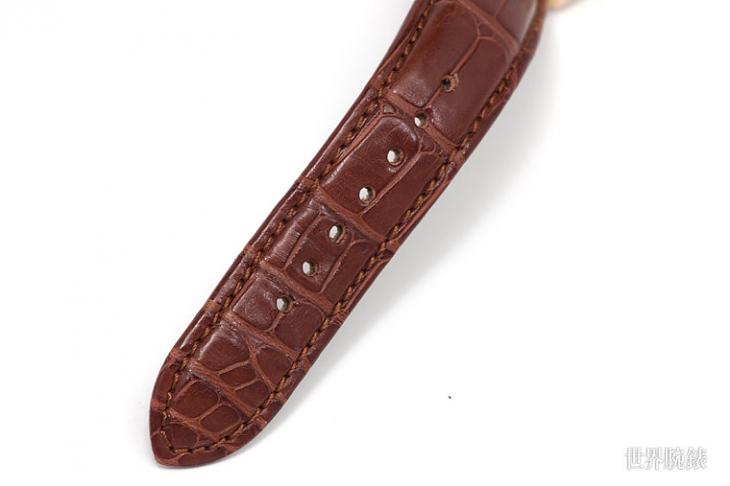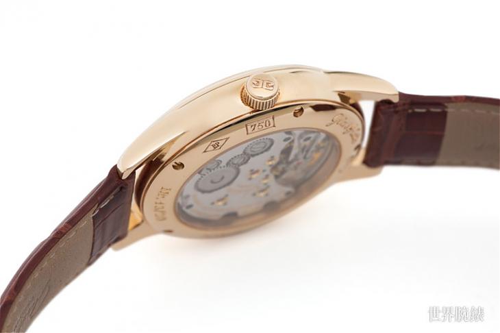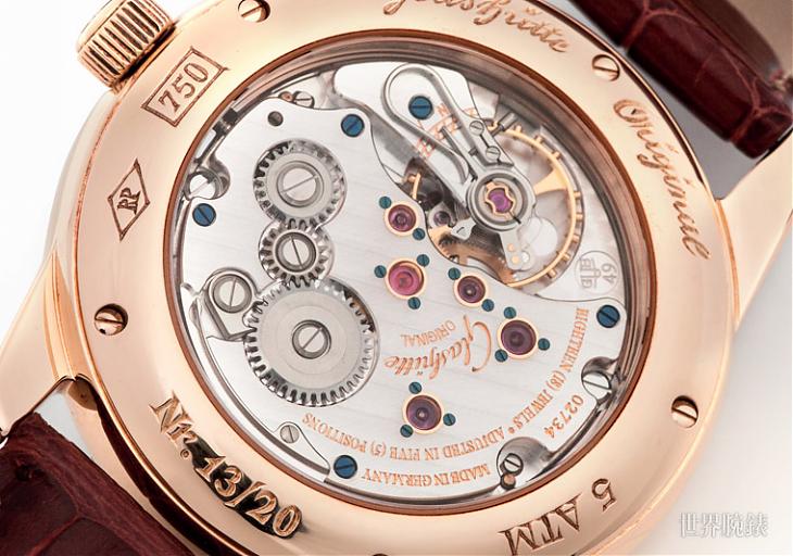 錶款搭載的格拉蘇蒂原創的經典49手上鍊機芯,基板上大片的日內瓦波紋加上黃金套筒、藍鋼螺絲等這些細節顯得美不勝收,而更精彩的部份則是出現在四分之三橋板的對向——也就是配有金質配重螺絲的擺輪,鵝頸微調零件表面鍍上一層錫之後展現與基板有別的光澤層次,同時會採用這等微調機制的機芯也象徵了更高規格的製錶工藝,格拉蘇蒂原創揚名錶壇的本事從機芯的各項細節中表現得非常清楚。