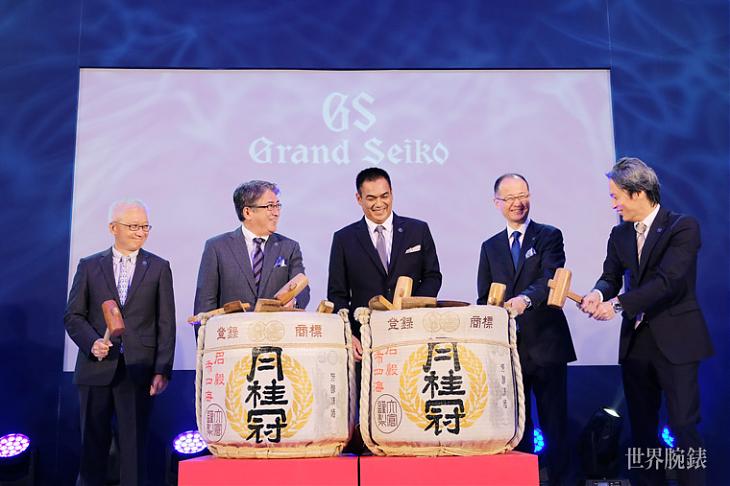 ▲台灣精工副董事長洪明仁(左起)、專務取締役兼台灣精工董事長石黑實、台灣體壇巨擘陳金鋒、SEIKO社長 高橋修司、台灣精工總經理前田健一共同見證GRAND SEIKO獨立盛事。