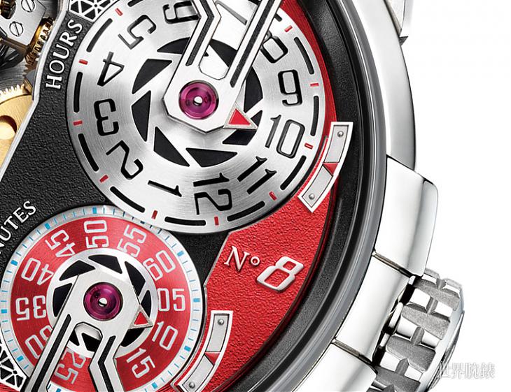 史詩陀飛輪8基本上延續了前代作品的基礎,包括兩枚裝軸陀飛輪、滾筒式動力儲存顯示等等,但是在面盤右半邊的顯時方式增添了新意,以固定指標而非開設視窗搭配轉盤的設計讓面盤看起來更有震撼力,也符合這系列藏不住的高調風格。兩枚雙軸陀飛輪看起來不只聳動,能透過差動裝置來輸出穩定的動能,沒有嚴謹的設計以及精密的技術絕對做不來。