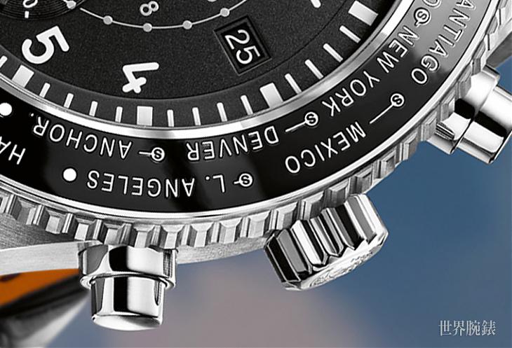 以往擁有世界時間顯示的腕錶設計模式,多半都是把多個城市名稱印在面盤中,但IWC特意在經拋光處理的黑色旋轉錶圈上刻印著24個城市的名稱,佩戴者只需旋轉錶圈,時間便會同步傳輸至時針與一個能顯示當前時區晝夜的小型24小時指針以作顯示,日期顯示亦同樣隨之移動,即使某些時區的時差與原居地跨過午夜,日期亦懂得自動調整,而每個具有夏令時制的國家在旋轉錶圈上均帶有小型"S"標誌,更仔細準確地指出不同城市的時間,一個動作便能聰明且簡單地操控時間資訊繁多的世界時間腕錶,解決了不少經常四處外出的男士們的不便。大家可以絕對放心,這簡易特別的功能絕對不會因多次旋轉錶圈而影響機芯與分針的運作。