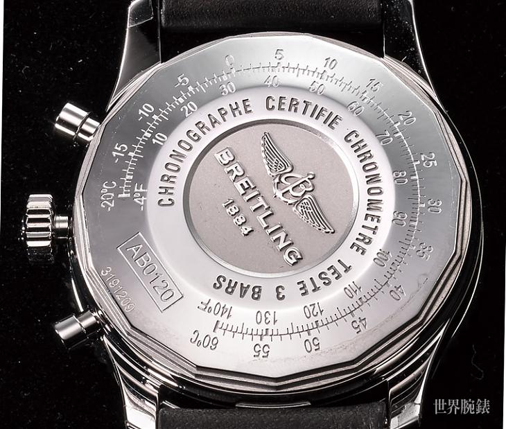 ▲現行的一般版採用實底蓋,底蓋外圈刻的是攝氏和華氏溫度的對照表。搭載百年靈自製的B01機芯,這也是目前市面上的自動計時機芯當中號稱「怎樣都玩不壞」的優秀機種,它有C.O.S.C.認證。