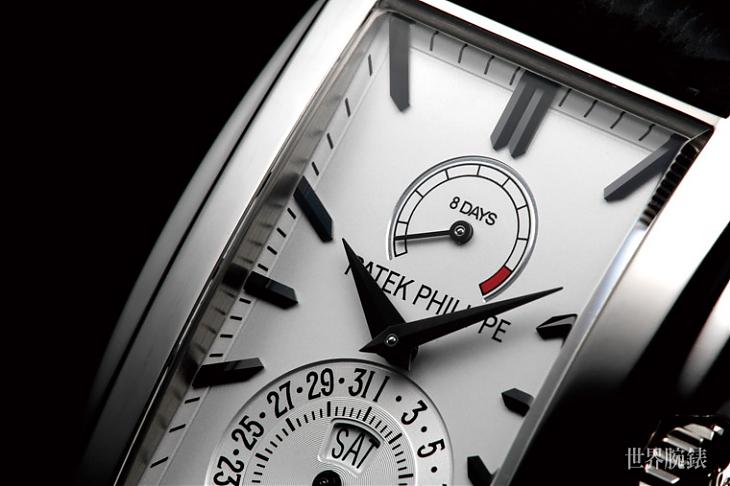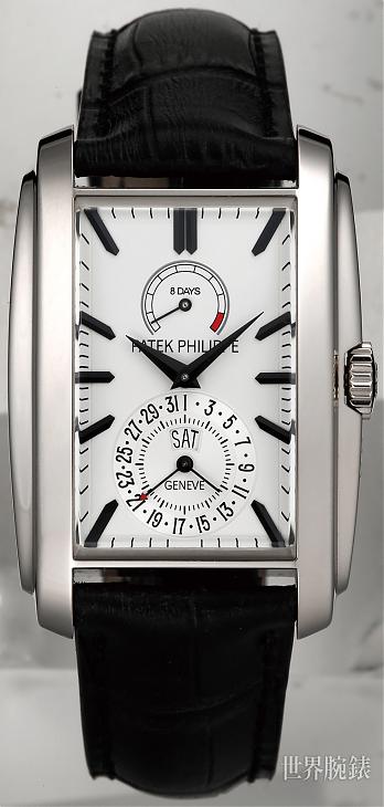 18K白金材質/28-20 REC 8J PS IRM C J手動上鍊機芯/時、分、小秒、指針式日期、星期顯示/八日動力儲存顯示/百達翡麗印記/藍寶石水晶鏡面、透明底蓋/防水30米/錶徑46.9x32.4mm