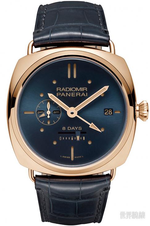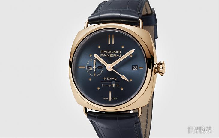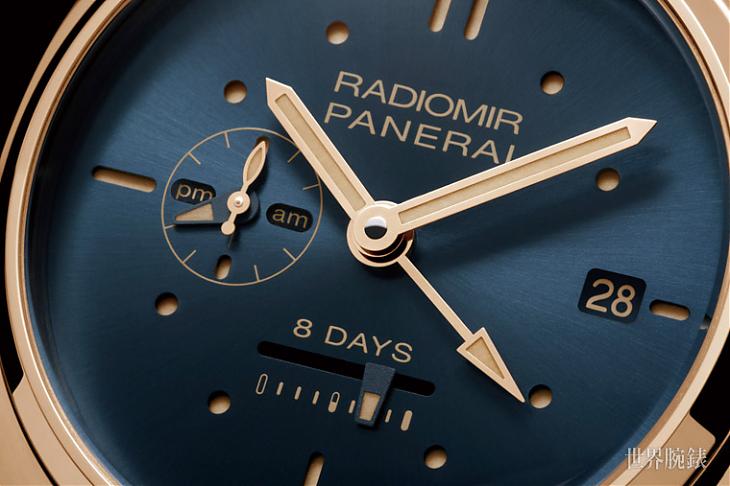 在面盤布局上,承襲沛納海簡約設計的風格,御繁化簡,在細膩藍色太陽紋飾盤面上,擁有日期、八日鍊動力儲存顯示與第二時區、日夜顯示等時間資訊,但巧妙的佈局卻將這些資訊一一整理的有條不紊,3點鐘的日期窗、6點鐘的八日鍊線型動儲、9點鐘的小秒與日夜顯示等,皆收束於雅緻的藍色太陽紋面盤上,輔以幾何風格的小時刻度,一體成形的大氣風範儼然而生。