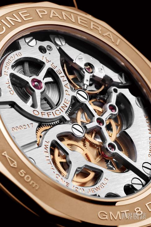 PAM00538/18K玫瑰金材質/P.2002/10手動上鍊機芯/時、分、小秒、日期顯示/兩地時間功能/日夜、線性動力儲存顯示/藍寶石水晶鏡面、透明底蓋/防水50米/錶徑45mm/限量300只/參考價:約NT$ 1,093,300