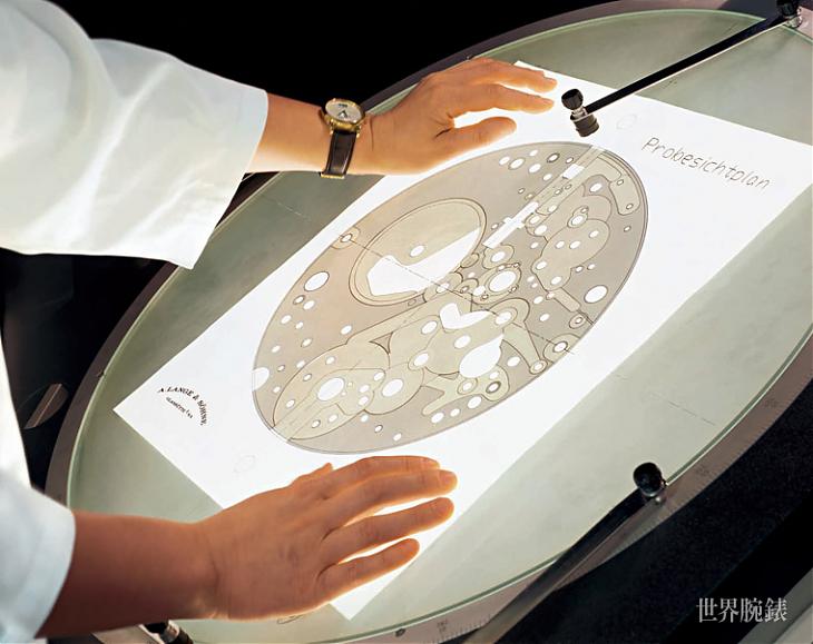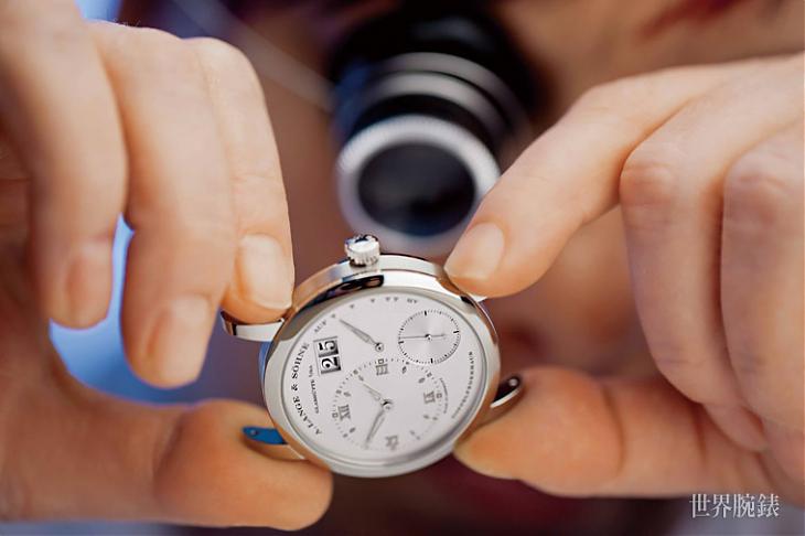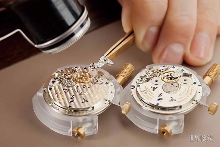 一般品牌組裝機芯的程序只有一次,但傳承德式製錶精神的朗格,第一次組裝程序結束後,必須經過五方位調校測試,然後再逐一拆開清洗每個零件。二次組裝時使用藍鋼螺絲,不同於第一次組裝所使用的組裝專用螺絲,此舉主要是避免拋光後的螺絲帽受損或刮花,機芯最後的組裝是在3~12倍數的顯微鏡下完成。此外,為了降低機芯磨損的機率,朗格精選適當等級的特殊潤滑油,為所有的軸承與滑動表面上油,讓所有零件能順利地運轉。