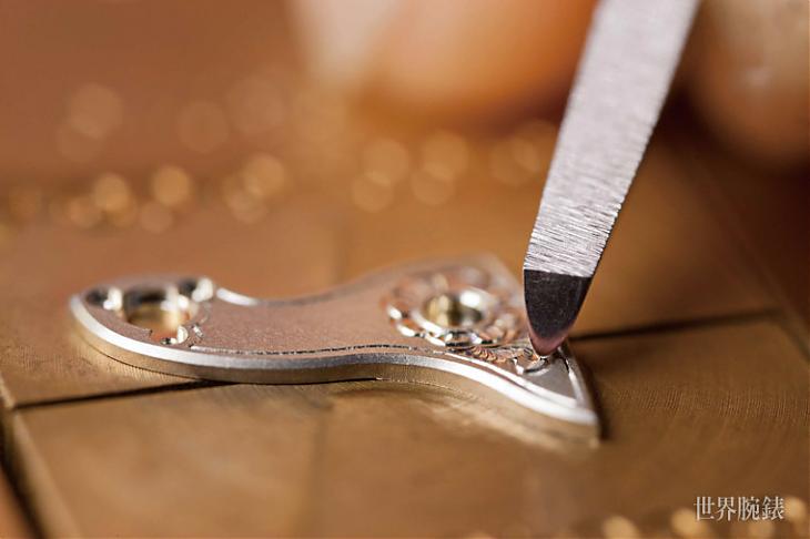 ▲雕刻師採用的工具的精密度極為重要,不僅需仔細注意擺輪夾板,也要留意雕刻刀的尖端。因分毫之差就會導致不鏽鋼邊緣破損。