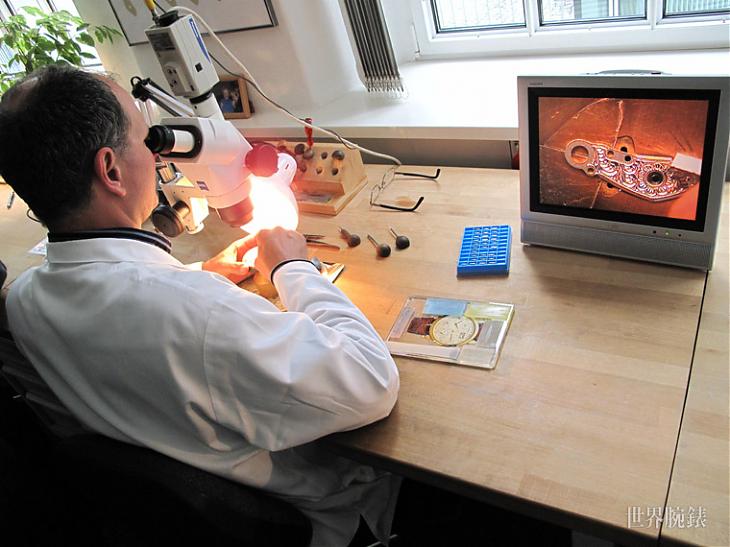 ▲雕刻師的作品通常呈現於半平方釐米的表面; 因此,必須在顯微鏡下進行擺輪夾板雕刻,否則差之毫釐失之千里。