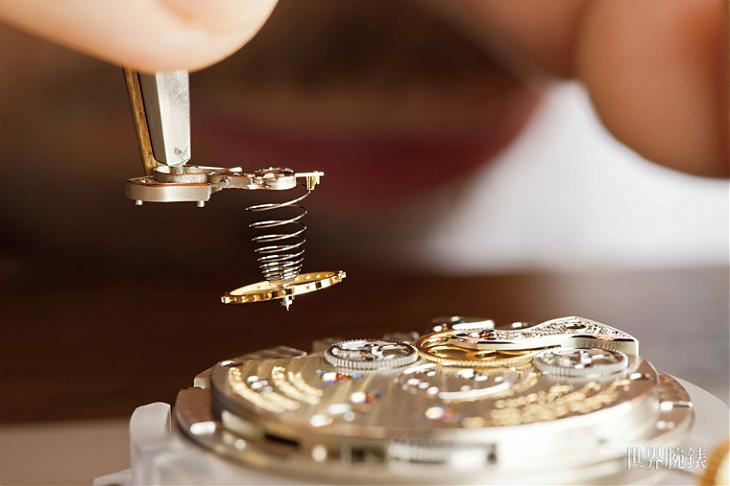 ▲只有極為堅定的雙手,才能組裝擒縱與擺輪系統。這不但需固定擒縱桿、調整出口與入口擒縱叉,也需計算自製游絲的有效長度。
