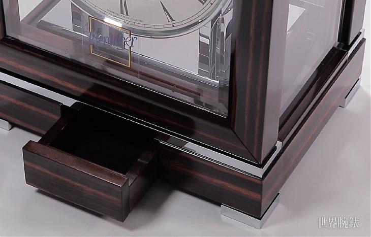 ▲鐘箱做工精緻,底部小抽屜可存放發條鑰匙