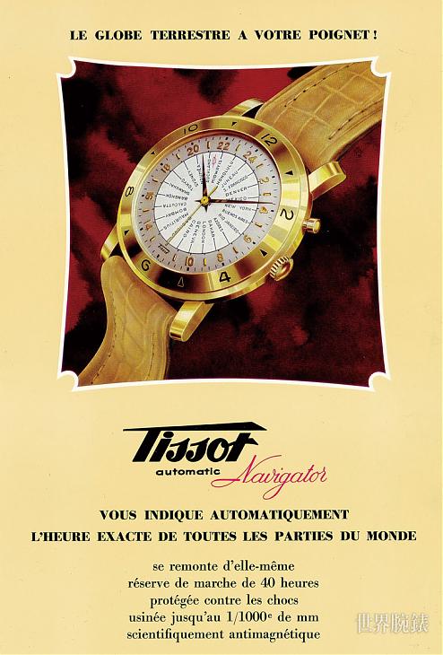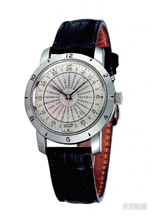 世界時區顧名思義即是跨越世界24時區的顯時裝置,當然這項技術礙於交通技術問題在五○年代以前並未出現,然而大戰後科技飛快的進步帶動了世界時區時計的出現,宛如雨後春筍般各大腕錶品牌都相繼推出世界時區腕錶,在這波潮流之中,天梭亦發明了Heritage Navigator的最初面貌,具有24個時區顯示的面盤,以俐落鮮明的不鏽鋼材質,搭配純白面盤、藍劍指針,佈局了Heritage Navigator經典的錶情。