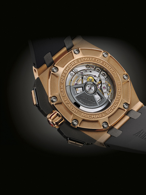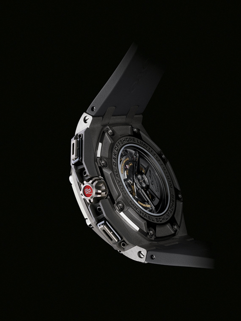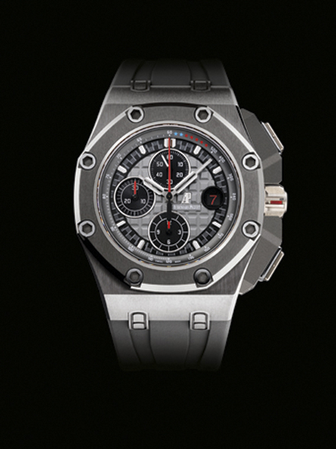 AUDEMARS PIGUET研製的麥可‧舒馬克皇家橡樹離岸型計時碼錶,完美體現世上最成功車手的嚴謹精神。此錶搭載超大的44毫米錶殼,其中1,000枚以輕巧鈦金屬製成,另備有500枚典雅的玫瑰金款式和100枚鉑金款式。在設計上,各個層面均從麥可‧舒馬克的高速賽車世界中取材,展示出時間就是一切的精髓。