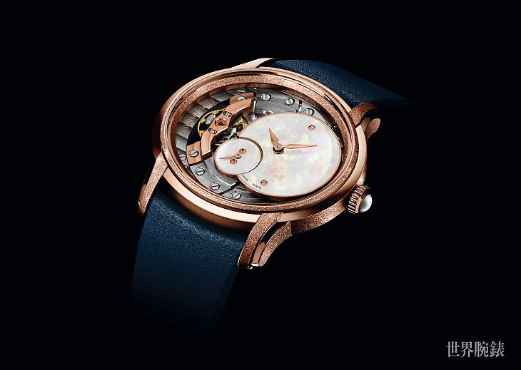 18K玫瑰金材質/5201手動上鍊機芯/偏心時、偏心分、小秒顯示/錶款鑲鑽/珍珠母貝面盤/藍寶石水晶鏡面、透明底蓋/防水20米/錶徑28.59x32.74mm