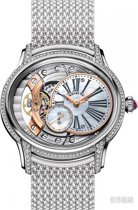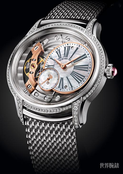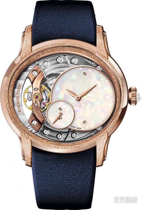 除了金屬鍊帶,千禧系列也推出一款蛋白石面盤的新版本,是首度在千禧腕錶選用此種精緻的寶石。同時也運用霜金裝飾技術,愛彼目前僅在皇家橡樹系列上使用過這項技術。