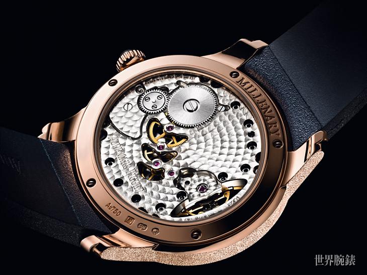 ▲5201機芯將擒縱系統反置於面盤側,背面基板則以大量的魚鱗紋加以修飾,機芯的震頻為3Hz,動力儲存則有49小時。
