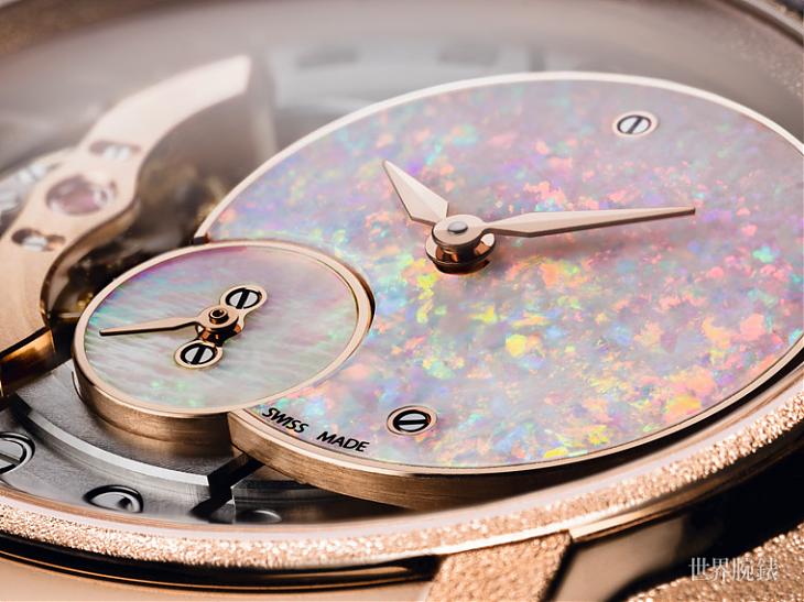 18K玫瑰金材質/5201手動上鍊機芯/偏心時、偏心分、小秒顯示/蛋白石面盤/藍寶石水晶鏡面、透明底蓋/防水20米/錶徑28.59x32.74mm